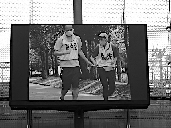 今回は、会場に設けられた大画面テレビで、各団体のPR動画が披露されました。友の会でも動画を作りました。写真はその一場面。友の会の九曜会長が伴走者とともにジョギングをしている様子です。九曜会長は、去年のオリンピックで聖火ランナーを務めました。
