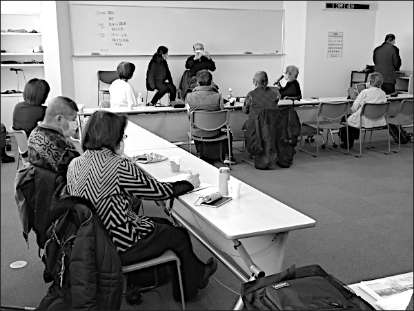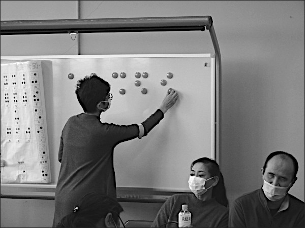 11月28日は5回目。点字の初歩を学びました。九曜会長と会員の二人の講師が、点字が6つの点で構成されること、母音と子音の組み合わせであることを説明していきました。点字は初めてという人がほとんどで、一生懸命、メモを取っていました。