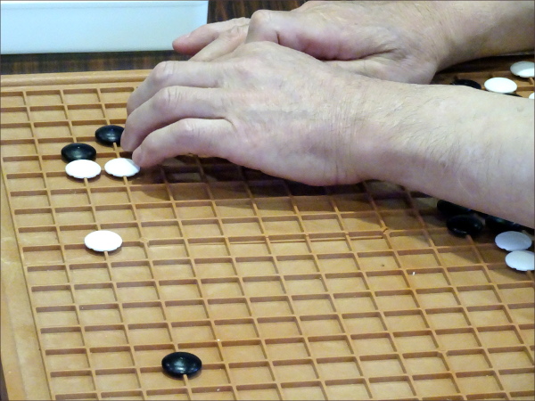 - 触って楽しめる碁盤。盤には、仕切り板のようなものが縦横に組んであり、その交差点に、石をはめ込みます。一度はめ込むと、ずれることがありません。黒石と白石は、表面の刻みが異なり、触ってわかります。