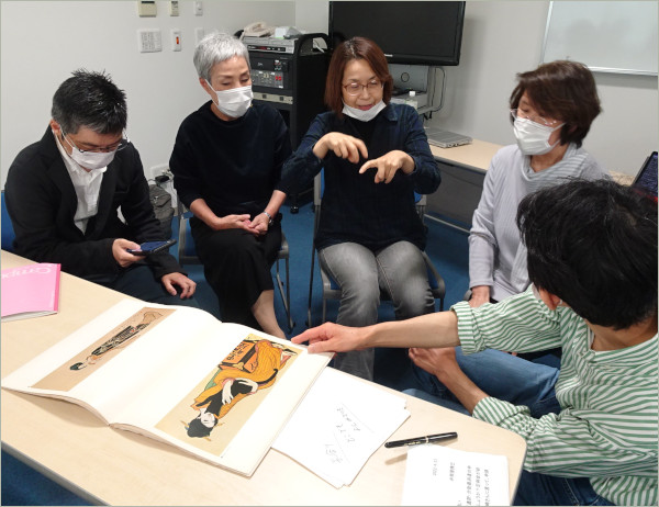 こちらのグループは、着物を着た女性の絵。弱視ろうの会員に、手話や筆談で伝えます。「着物が長すぎない?」「指も長い気がするしバランスが悪くないかな」「抱いているのは猫?大きすぎない?」 竹久 夢二の代表作が率直な評価に見舞われました。