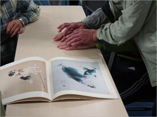 この日のメインテーマは「盲ろう者と絵を楽しもう」です。『目の見えない白鳥さんとアートを見に行く』(川内 有緒著、集英社インターナショナル)で実践が紹介されたように、一枚の絵を前に、目えない人と見える人がいっしょに絵についておしゃべりしようという試みがあります。美術史などの知識は不要、見える人が率直な感想を語り、見えない人が質問をする、そのやりとりが楽しい、と本に書かれていいます。