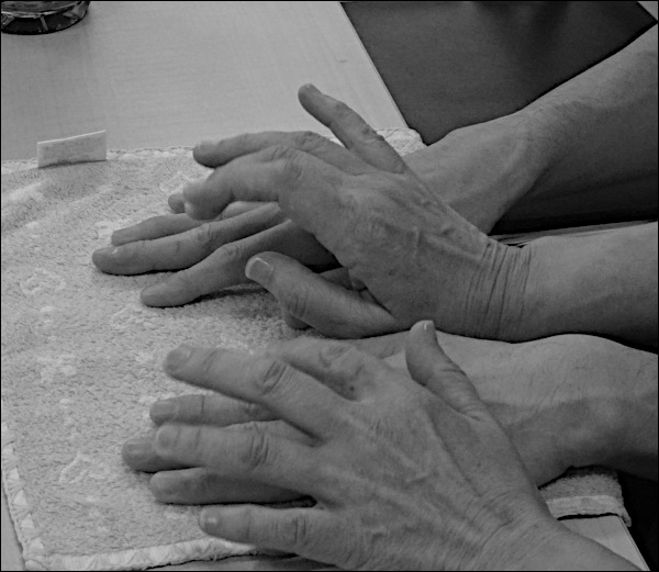 荒さんは最初は耳が聞こえなくなり、のちに全盲になりました。点字の指導をしていた通訳・介助者から「荒さんと会ってほしい」と頼まれて、荒さんが入院している病院に見舞いに行ったのです。荒さんはお母さんといっしょにいらっしゃいました。とてもおしゃれな女性でした。ここで問題です。