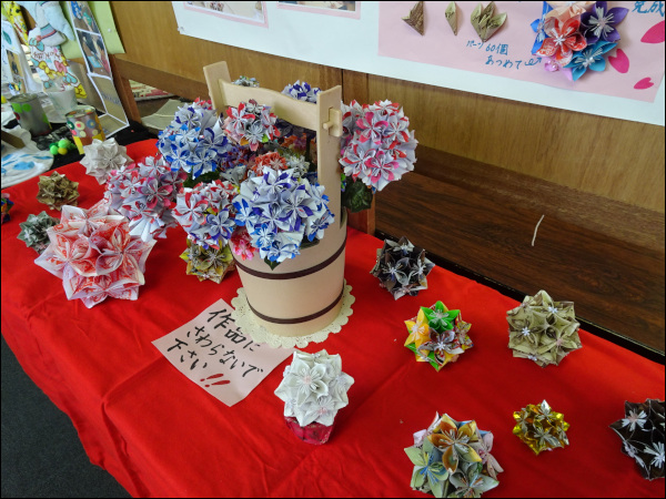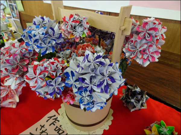 そして、初めての作品展示。このブログの9月14日の「活動報告」で制作の様子を紹介しましたが、新聞の折り込みチラシを折って花びらを作り、花びらを5つ組み合わせて花を作り、花を60個組み合わせて玉を作ります。