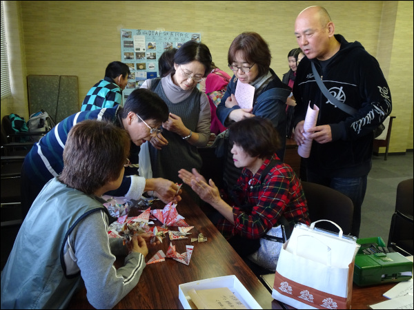 尚、相談コーナーの隣に、紙を折って花を作るやり方を紹介するコーナーを設けたところ、とても人気で、作品を見た人が次々に訪れては、折り方を習っていきました。説明を聞いて「自分も作ってみる!」と意気込んで帰っていく人もいました。
