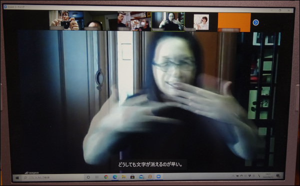 もう一つが文字通訳。Zoomの画面の下に字幕を出しています。ただし、Zoomに載せた字幕は、出てから消えるまでの時間が短いようです。
