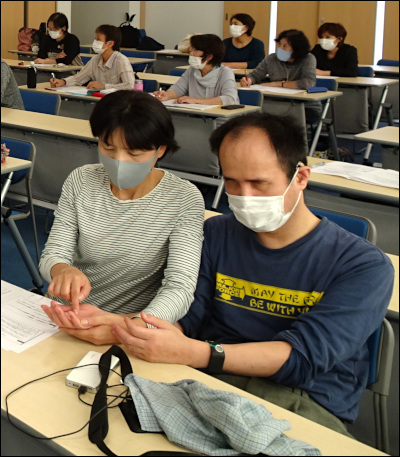 講演の後は質疑応答です。盲ろう者会員からは「地震の揺れから命を守るために、家具の固定をしたいと思っている」「盲ろう者の中にはスマホが使えない人も多く、緊急地震速報などの情報が得られない。どうしたらよいか」などの意見や質問が出ました。