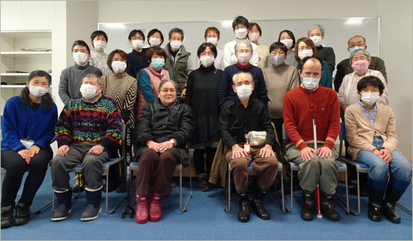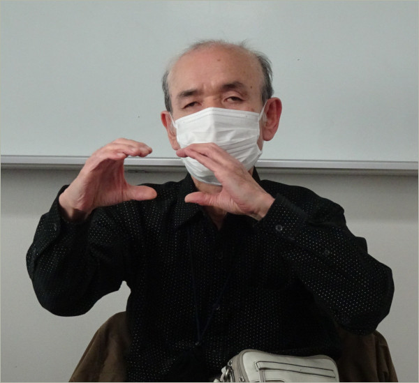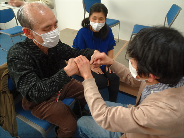 12月18日(土)の定例会は、石川盲ろう者友の会の宮永 聖明(しょうみょう)会長においでいただき、触手話の講演と体験会をお願いしました。富山の友の会には現在、触手話をふだんから使う会員はいませんが、手話を使う弱視会員と支援者は、将来にわたってスムースにコミュニケーションできるよう、触手話を学んでいきたいと考えています。