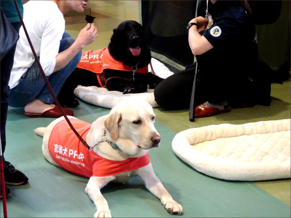 - 盲導犬のコーナー。大人にも子供にも、大人気です。実際に、盲導犬といっしょに歩く体験もやっていました。