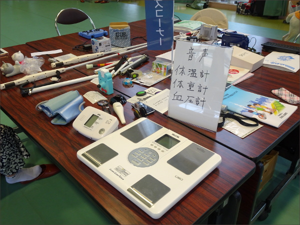 - 音声でデータを教えてくれる、体温計、体重計、血圧計などのコーナー。このほか、 拡大読書機や音声読み上げ装置、弱いレーザー光線で網膜に画像を投影する装置なども展示されていました。。